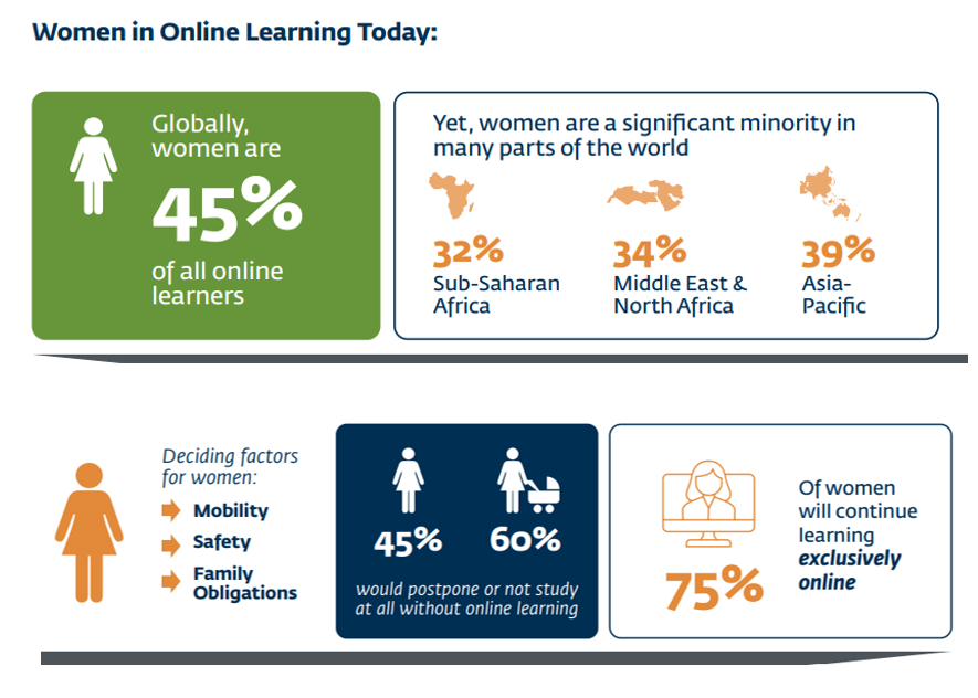 Online learning models, which take advantage of technology and have cheaper delivery costs thanks to the expansion of broadband connectivity, are helping to reach previously unreachable women.