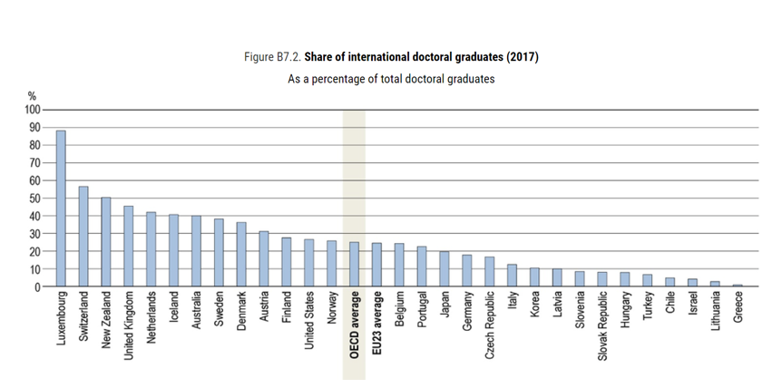 Countries are ranked in descending order of the share of international doctoral graduates among total doctoral graduates.