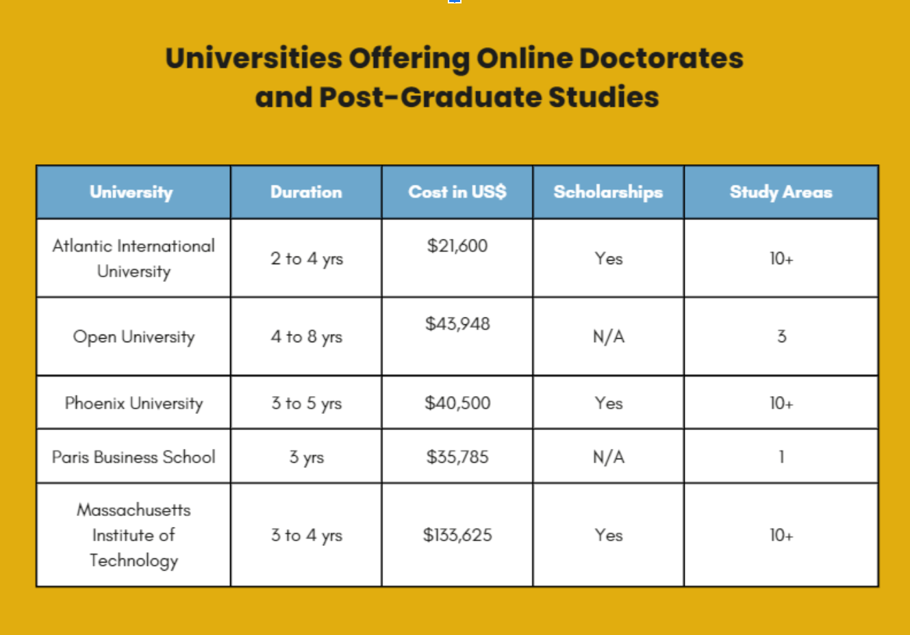 This comparative table can be very useful for you to be able to buy the options that currently exist in online Doctorates: