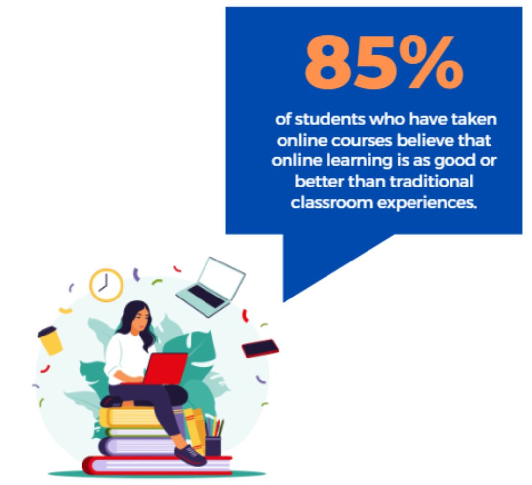 A survey by Learning House and Aslanian Market Research found that 85% of students who have taken online courses believe that online learning is as good or better than traditional classroom experiences.