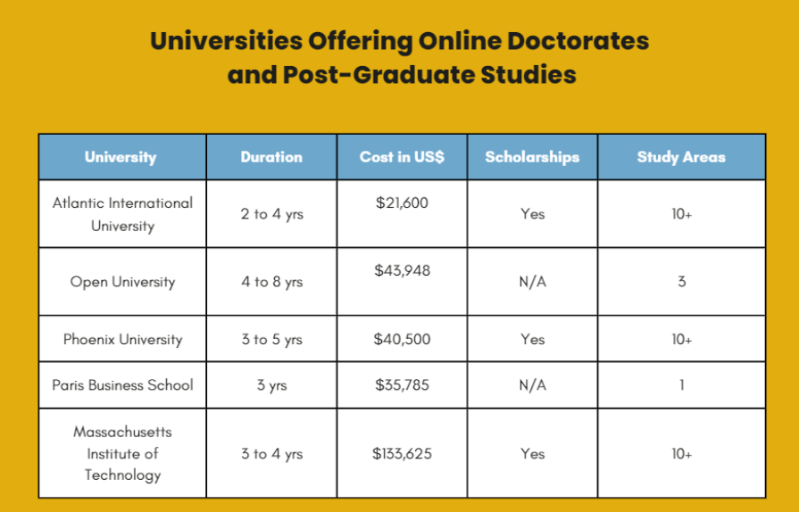 Below, you will find a comparison of some doctoral programs, and the investment to be made: